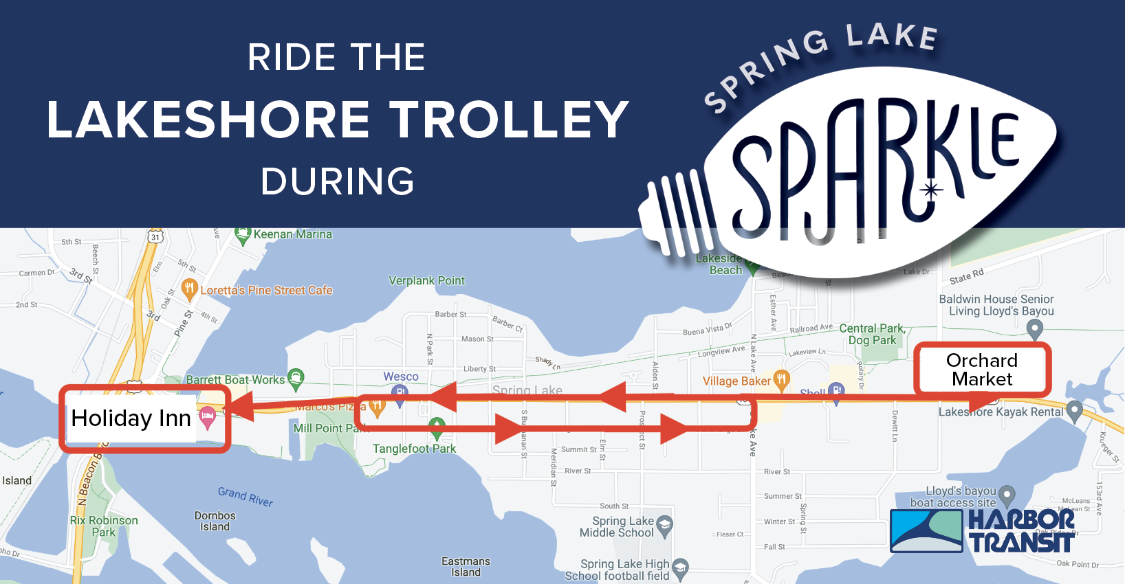 Experience the holiday magic of the Spring Lake Sparkle Festival aboard the Lakeshore Trolley! Park at the Holiday Inn or Spring Lake Orchard market to board the trolley, and enjoy a ride around downtown Spring Lake to take in the sights and sounds of the holiday season.